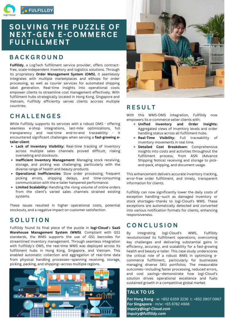 Fulfilldy 在 logi-Cloud 的 SaaS 倉庫管理系統 (WMS) 中找到了拼圖的最後一塊。符合 GS1 標準的 WMS 支持使用 GS1 條碼進行簡化的庫存管理。通過與 Fulfilldy 的 OMS 無縫整合,實時 WMS 被部署在其香港、新加坡和越南的履行中心。這使得能夠自動收集和匯總來自物理處理過程的實時數據 — 跨越接收、存儲、揀選、包裝和運輸 — 橫跨多個地區。